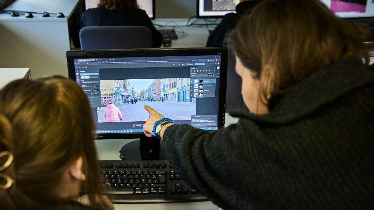Der praktische Teil widmete sich der Frage, wie Zukunftsbilder mithilfe bildgenerierender Künstlicher Intelligenz entstehen können. Nach einer Einführung experimentierten die Jugendlichen mit eigenen Fotos, die sie zuvor im Kunstunterricht an Orten und Plätzen in Düren aufgenommen hatten. Diese wurden mit KI so verändert, dass die persönlichen Zukunftsvorstellungen sichtbar wurden. Dadurch entstanden erstmals echte Vorher-Nachher-Bilder.